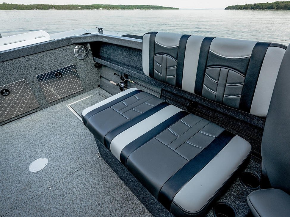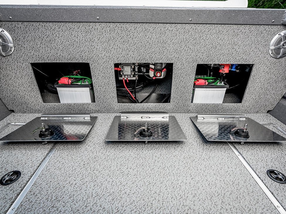 Other Interior Features Full Length Engineered Compound Angle Stringers Full Length Formed In-Hull Side Stiffeners Welded 3" Bow Rails Welded 8" Cleats (5) Welded High Mount Windshield Safety Grab Rails Welded Passenger Safety Grab Rails 1250 GPH Bilge Pump w/Auto Float Switch Battery Switch w/ACR Cockpit Side Wall Rod Holders (3) - Port & Starboard Diamond Tread Bow Step w/Storage Double Walled Recessed Diamond Tread Self-Bailing Bow Dual Battery Set-up Insulated Transom Fish Box Large 2" Fully Welded Bow Scuppers Plastic Conduit Under Bow for Running Wire Quick Connect Kicker Fuel Supply Sound Dampening Foam Wash Down System